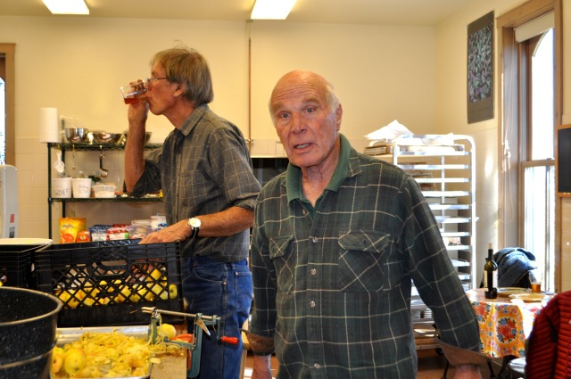 And for Joel and his daughter, Becca, showing up and with a bottle of Chokecherry "tipple" no less. That lifted everyone's spirits! They peeled more than a few apples too, to earn their mid-day meal.